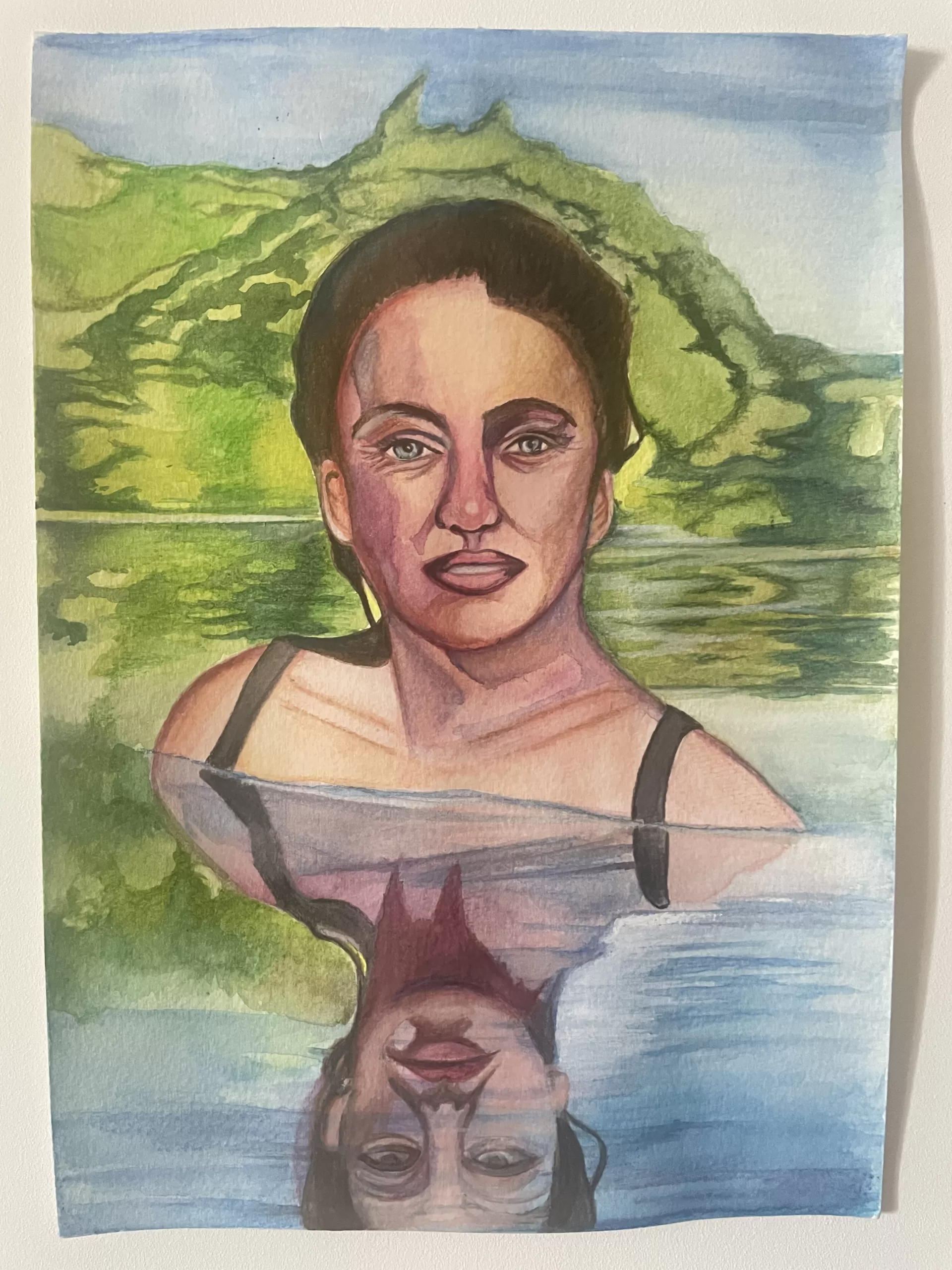 Emerging from a tranquil lake, a woman stares ahead with quiet intensity. Her mirrored reflection in the water evokes themes of duality, depth and self-awareness.